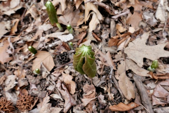 Mayapples are unfurling like little umbrellas on the forest floor. This is in New York City! (Brooklyn Botanic Garden's native flora section)