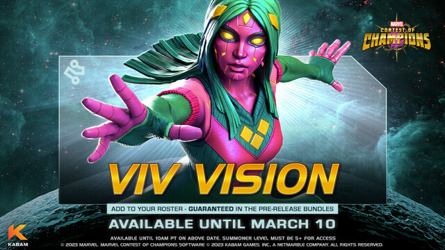 Add Viv Vision to your team, guaranteed, with this Pre-Release Bundle. Her power control will give your roster 20/20 vision. https://bit.ly/3qIA2Vo #MCoC #Marvel