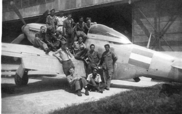#P-51 with #122(NEI)squadron crew in front of hangar #Medan 21-10-1947.