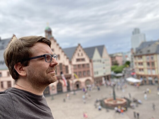 Die KI-Arbeitsgruppe gönnt sich zum Schuljahresabschluss unter der Leitung von Alexander Classen einen Ausflug auf den Dachbalkon der Nikolajkirche auf dem Römer.