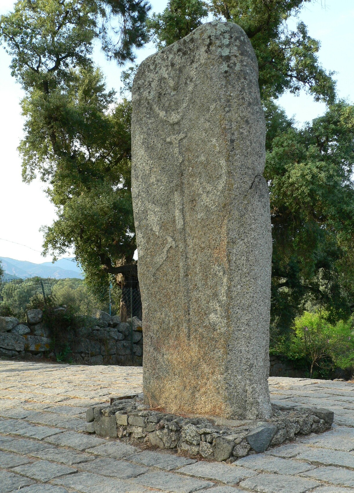Filitosa V, statue-menhir armée. On distingue sur la face antérieure une longue épée et un poignard dans son fourreau. Hauteur : 2,95 m , largeur : 0,96 m.