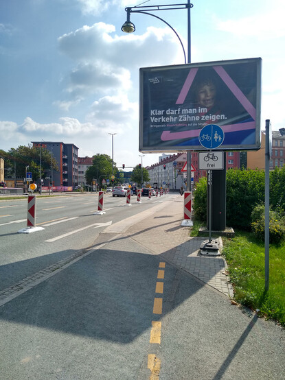 "Klar darf man im Verkehr Zähne zeigen." Ja, #mehrAchtung auf der Straße ist wichtig - doch eine Beschilderung, die mit Zusatzschild die Freigabe eines Radwegs für Fahrräder signalisiert, kündet eher von Desinteresse. Und: Geteilter Fuß-/Radweg und die einzige Markierung separiert einen 50 cm breiten Streifen!? Hier ist wohl eher ein gemischter Fuß-/Radweg gemeint. Nur eins von vielen Beispielen absurder Beschilderung in #Chemnitz. #chemnitzfährtrad
