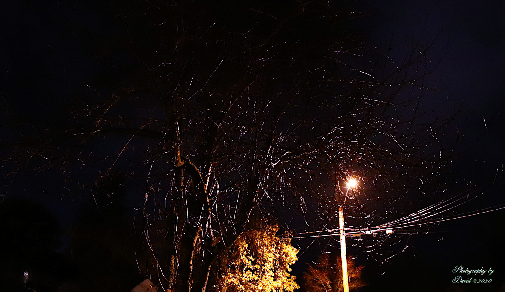 Looking through the Cherry Tree limbs after the rain at night