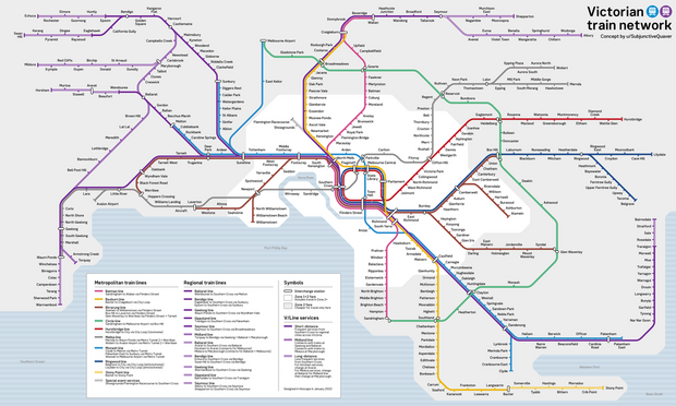 Love this future #Melbourne train map from u/SubjunctiveQuaver on Reddit. They’ve taken great care to pick the line colours that’ll ultimately end up being used, and have even included the City Loop reconfiguration where an extra tunnel portal is dug to create a bidirectional through line from Frankston to Cragieburn. Love the line names as well.