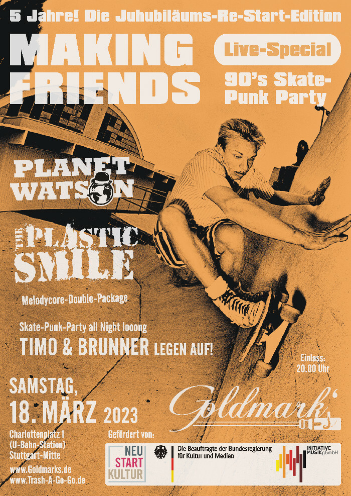 Am Samstag, 18. März 2023 im Goldmark's in Stuttgart: "Making Friends Skate-Punk-Party Stuttgart Live-Special" mit THE PLASTIC SMILE und PLANET WATSON – Zwei Live-Acts aus der Region in Sachen Melodycore im Stil der 1990er Jahre... und anschliessend Skate-Punk-Party all Night loooooong!