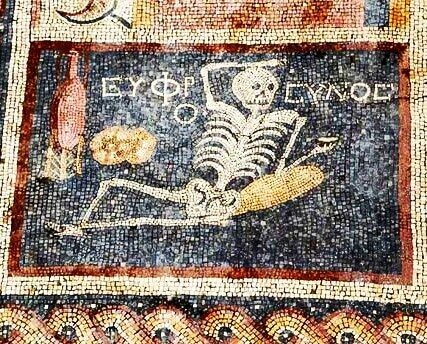 🪷 January 3rd is #MementoMoriDay, also known as #RememberYouDieDay! This squiffy #mementomori skeleton, resting on a cushion surrounded by wine and bread, says "Be merry, enjoy life!" #Antinous may have seen this mosaic in #Antioch in winter 129 AD. More: https://antinousstars.blogspot.com/2020/08/antinous-and-hadrian-enter-golden-city.html 🪷
