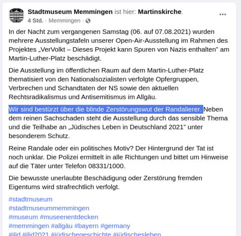 Da wird eine Ausstellung über die Opfer des NS in #Memmingen mehrfach beschädigt und das Stadtmuseum sieht »blinde Zerstörungswut der Randalierer«. Diese Art der Relativierung bestürzt mich ehrlich gesagt mehr als die Tat selbst... Damit war ja zu rechnen.