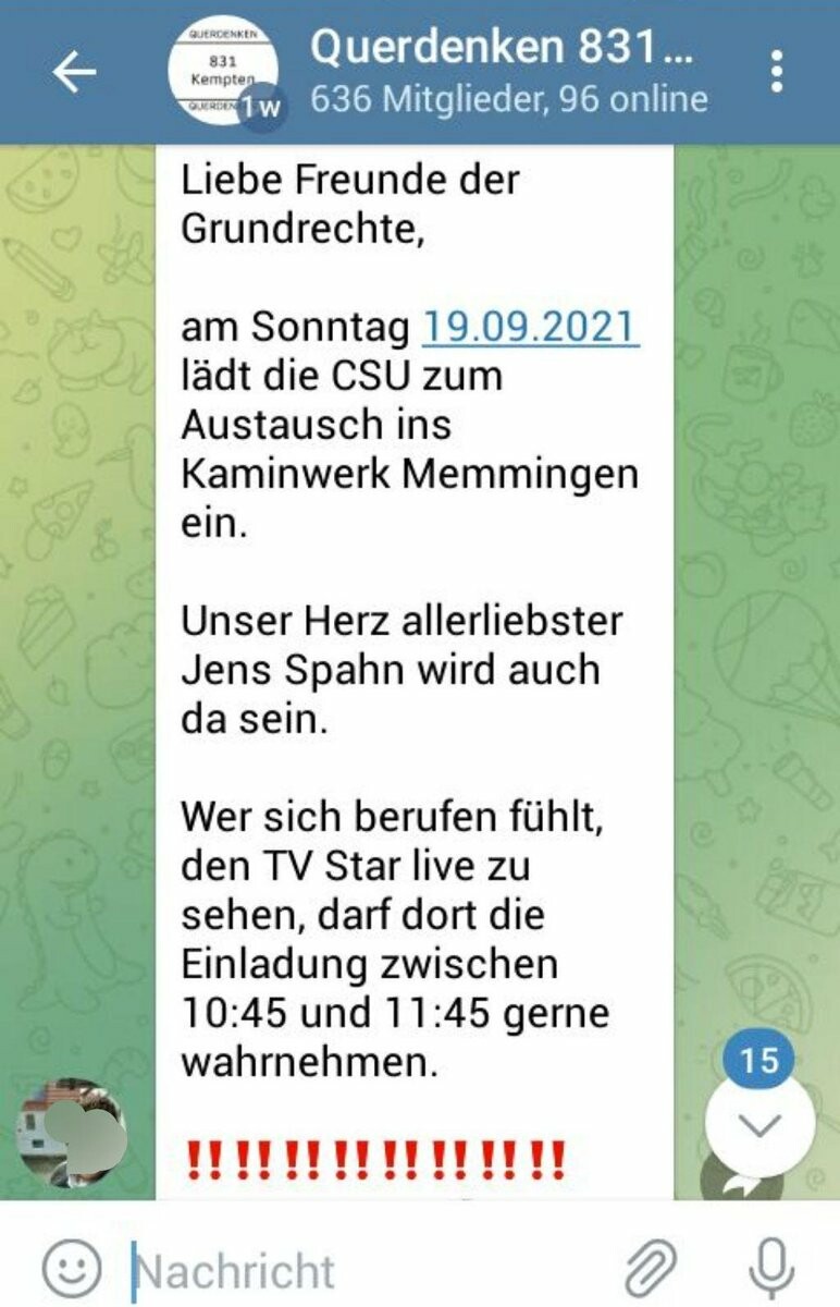 #Querdenken spricht über einen Besuch der morgigen Veranstaltung mit @jensspahn in #Memmingen. Die @PolizeiSWS ist informiert?