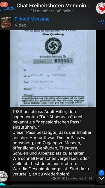 Falls sich wer schonmal geistig auf das ätzende Klientel heute Abend in #Memmingen einstellen möchte, findet in deren Gruppe "Freiheitsboten Memmingen" aktuell wieder die Relativierung von Holocaust und Nazi-Terror. #Querdenken