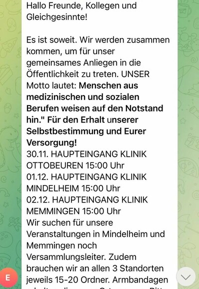 #Querdenken mobilisiert ab heute zu den Haupteingängen der Krankenhäuser #Ottobeuren, #Mindelheim und #Memmingen. Versammlungsbehörde schickt sie einige Meter weg, verpflichtet die je rund 100 erwarteten Teilnehmenden aber nicht zum Tragen von MNS. Die Inzidenz im Kreis: 929