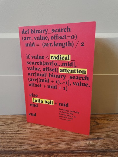 “In a world of infinite distraction, how can attention become radical?” - https://www.pagesofhackney.co.uk/webshop/product/radical-attention-julia-bell/