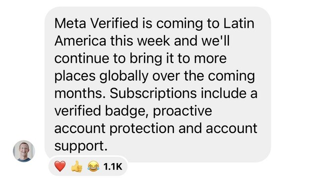 #Meta CEO #MarkZuckerberg said, “#MetaVerified is coming to Latin America this week and we'll continue to bring it to more places globally over the coming months. Subscriptions include a verified badge, proactive account protection and account support.”