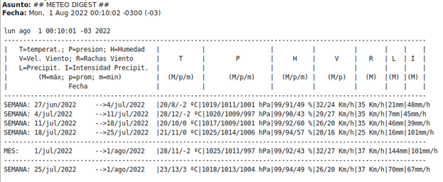 El servidor que procesa los datos de la estación meteorológica me mandó el digest de julio ayer. Este fue el panorama por el Pinar. https://undernet.uy/wx/ El último renglón de la semana, deberiá haber salido antes del mes, eso lo voy a arreglar. Hubo mínimas de -2º, lluvias por 144mm, una máxima de 28º... de todo. #meteo #weather #meteorología #ciencia #clima