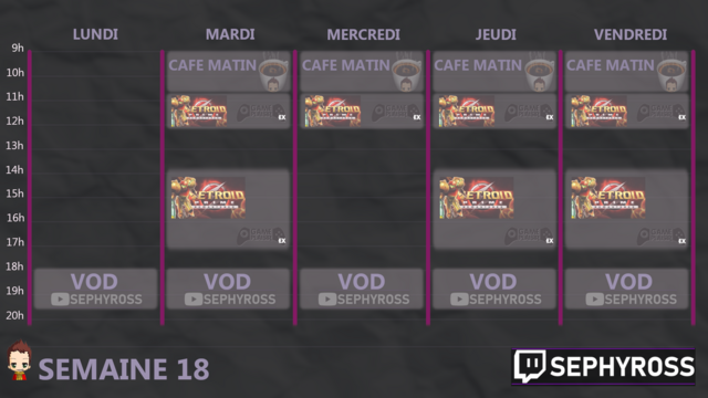 Programme Semaine 18 >>> twitch.tv/sephyross #cafematin #popculture #jeuxvideo #stream #twitch #twitchfr #playthrough #letsplay #videogames #twitchstreamer #metroid #metroidprime #retrostudio #nintendo #switch #samusaran #samus