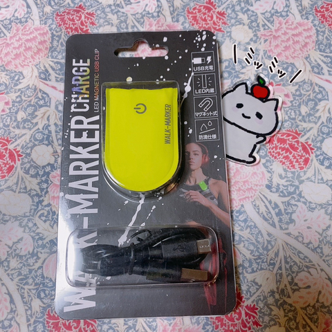 夜にウォーキングとかジョギングするとき暗くて危ないから光る何かが欲しくて、マグネットで袖とかに挟める光るやつ買った。