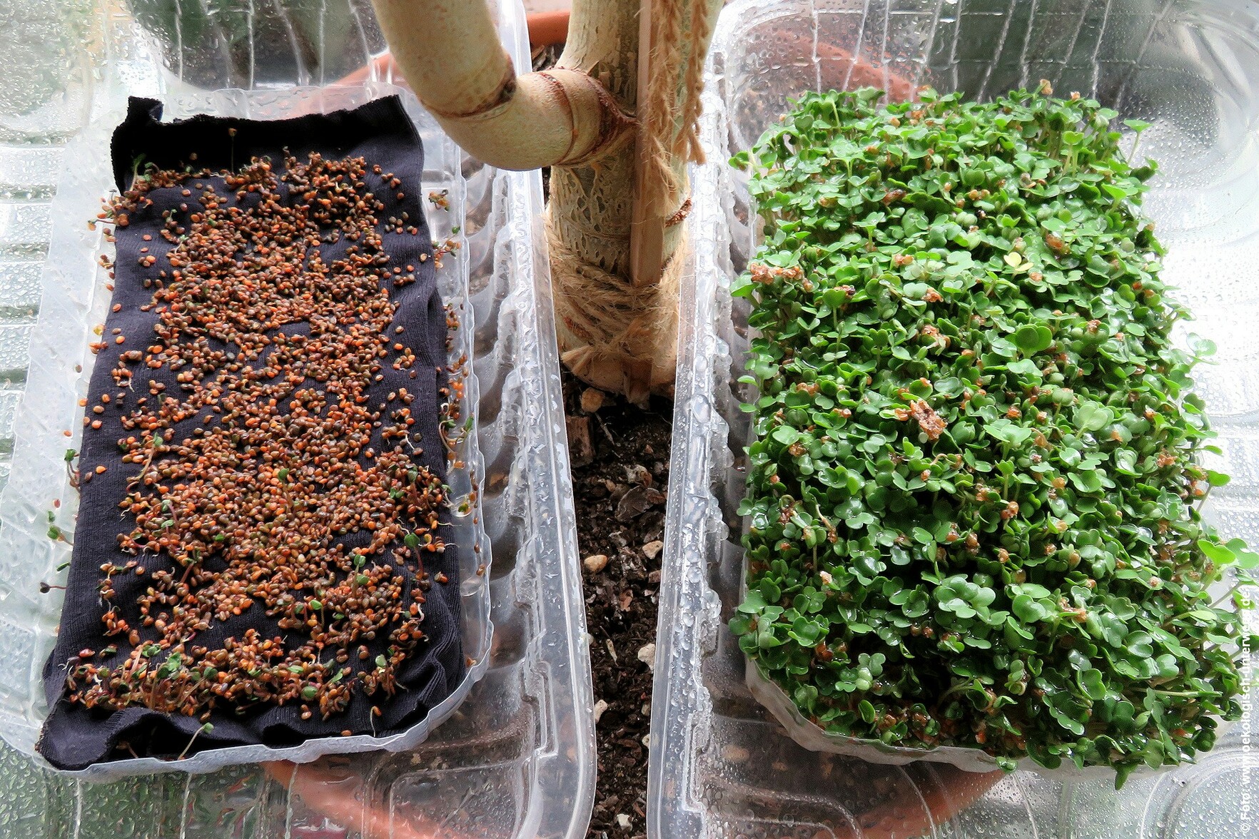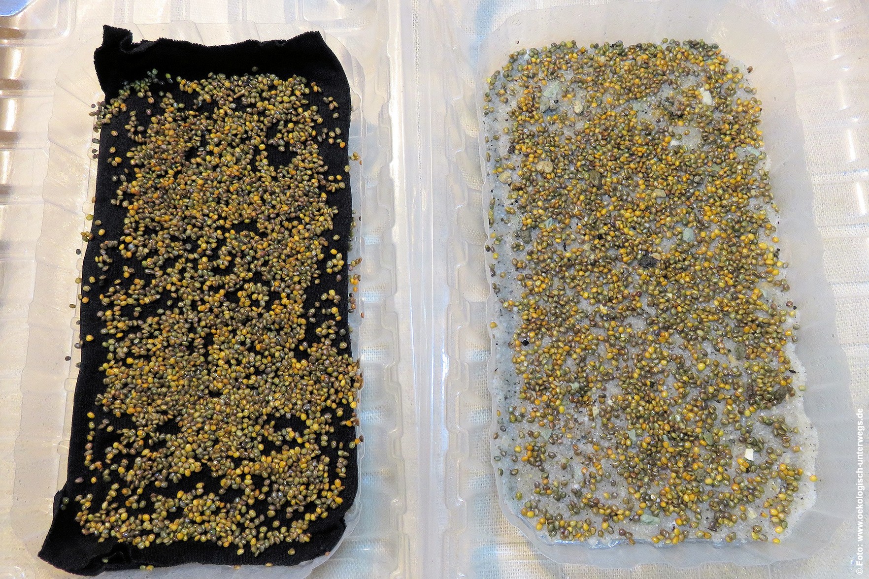 Hier das Ergebnis von links #Salatrauke auf Stoff und rechts auf Sand. Auf Stoff haben sie nicht gut gekeimt, denn die Oberfläche ist immer schnell abgetrocknet. Auf Sand waren sie zu dicht gestreut, sind zusammengeklebt und haben sich dann hochgehoben.