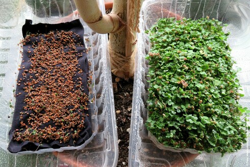 Also dann: Ich probiere Eure Vorschläge aus: Links #Salatrauke auf Stoff, rechts auf Sand. Die Spannung steigt.... 😍