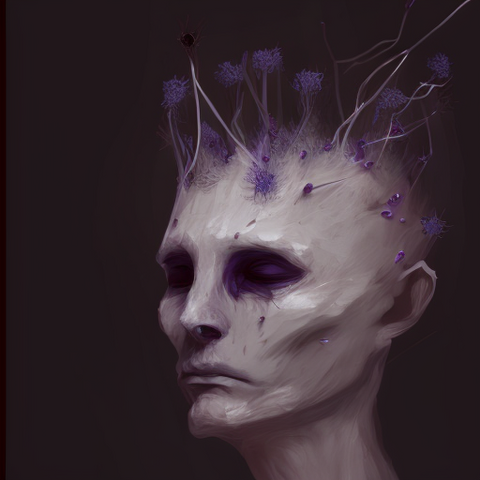 From a #dream I had last night of a person who had cracked their skull and the effect was calcification on the outside of their face and hair. So they stuck flowers in their hair. This isn't quite as sadly haunting, but it is interesting. Made using a drawn starter image in #midjouneyAI