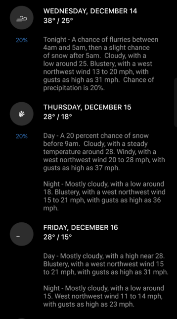 The US National Weather Service has scheduled a Winter Storm Warning for tomorrow at our location between 1am to 7pm.