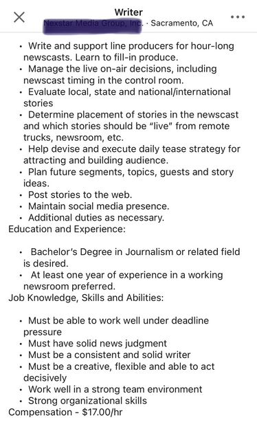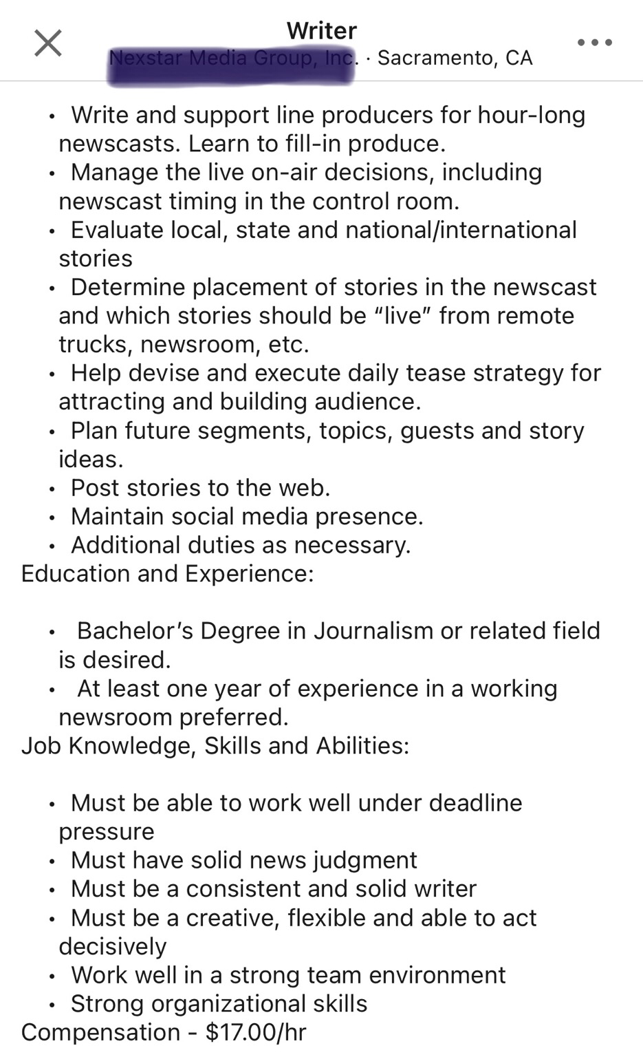 The status of #journalism: A major news network in Northern California is offering $17/hour to the professional responsible for evaluating stories and determining the placement of such stories on air, among other responsibilities. 🤯