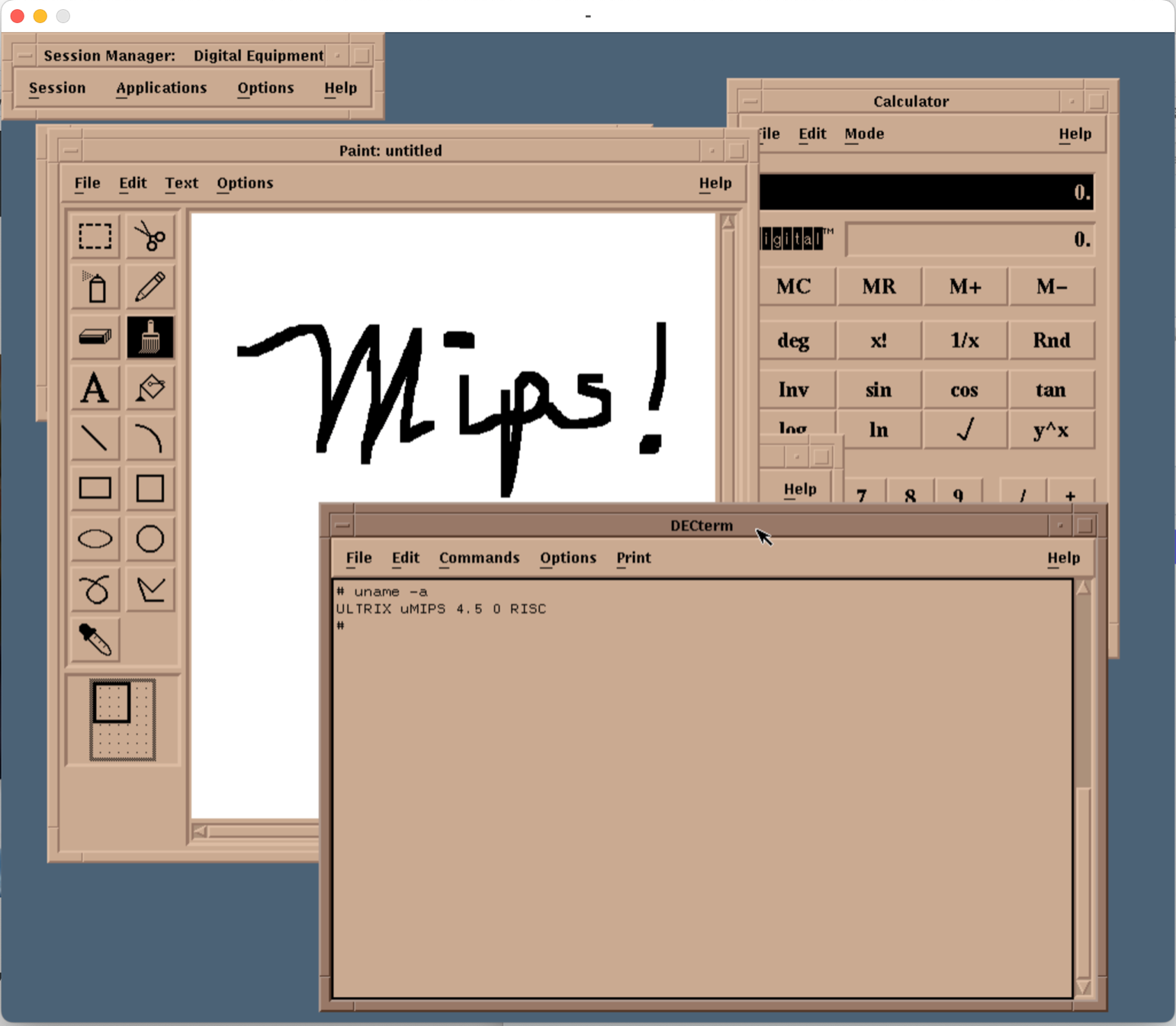 Ten years ago, Dmitry Grinberg became known for his Linux emulator running on an 8-bit AVR. Did you know that he also built an ARM Cortex M-based business card which is able to run Linux in his homebrew MIPS DECstation emulator? This emulator also compiles and runs nicely on a regular Unix (macOS here, only a few fixes required) using SDL2. Here you can see it running Ultrix 4.5. #retrocomputing #MIPS #DEC