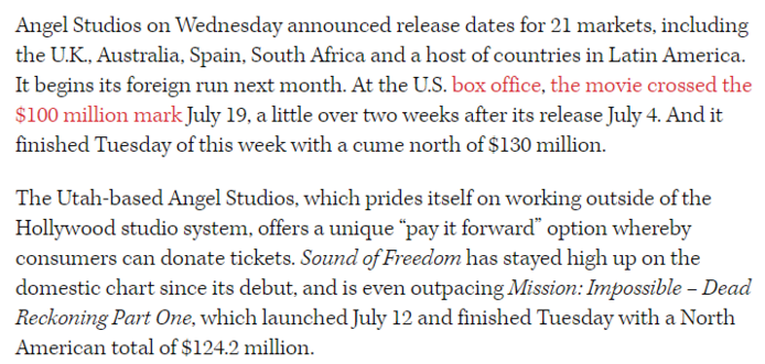 What the heck? #SoundOfFreedom is STILL ahead of #MissionImpossibleDeadReckoningPartOne in #USA sales, with #SoundOfFreedom at $130 million and the #MissionImpossible film at $124.2 million