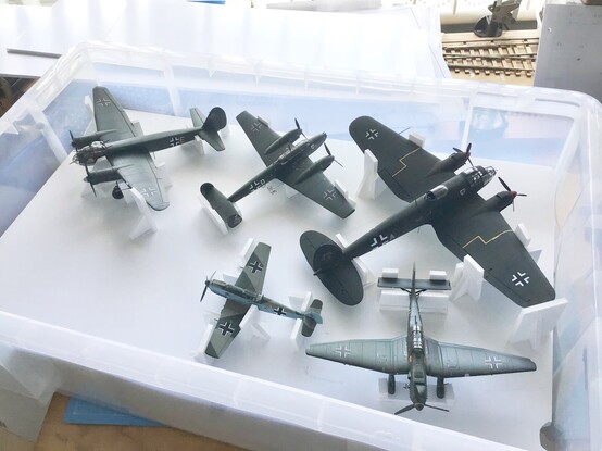 Each model is supported on foamboard "trestles" so it doesn’t sit on its undercarriage, and is prevented from moving about to prevent damage during transport. I managed to get eight models fitted into two decks. There’s space for at least one more small model.