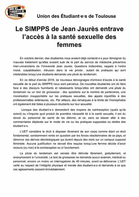 Le SIMPPS de l'Université Toulouse 2 Jean Jaurès entrave l'accès à la santé sexuelle des femmes. L'UET s'indigne de ces méthodes et exige que nos droits fondamentaux soient respectés sur notre lieu d'études.