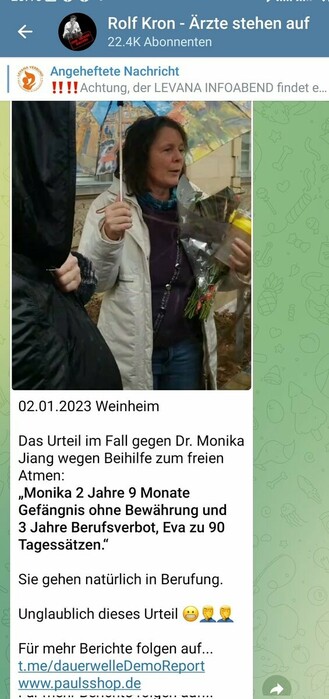 "Die Verteidigerin [von #MonikaJiang] bezeichnete den Prozess als - so wörtlich - "Terrorprozess", zog Nazi-Vergleiche und sprach von einem "totalitären Corona-Regime"."