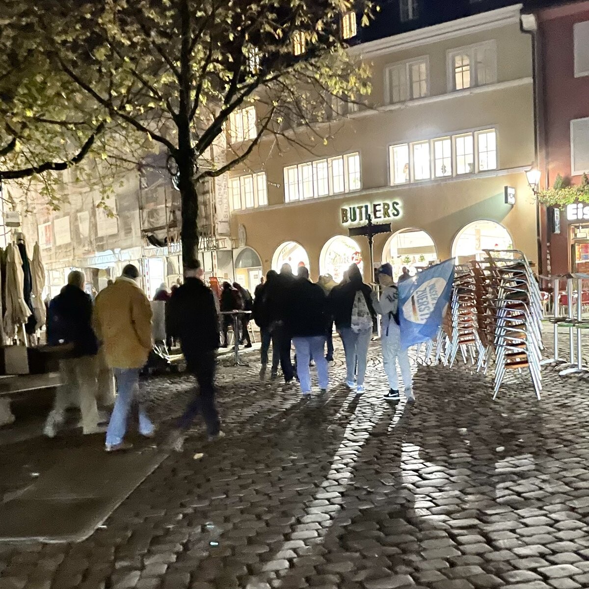 Hier läuft der #Freiburg|er #Montags-“#Spaziergang” komplett mit #noAfD Karl Schwarz, Nazijugend, #AfD Fahne durch die Innenstadt. @PolizeiFR hatte immerhin 1 (in Worten: einen!) Polizisten geschickt. Ich wurde von #Demo Teilnehmern gleich mal bedroht.