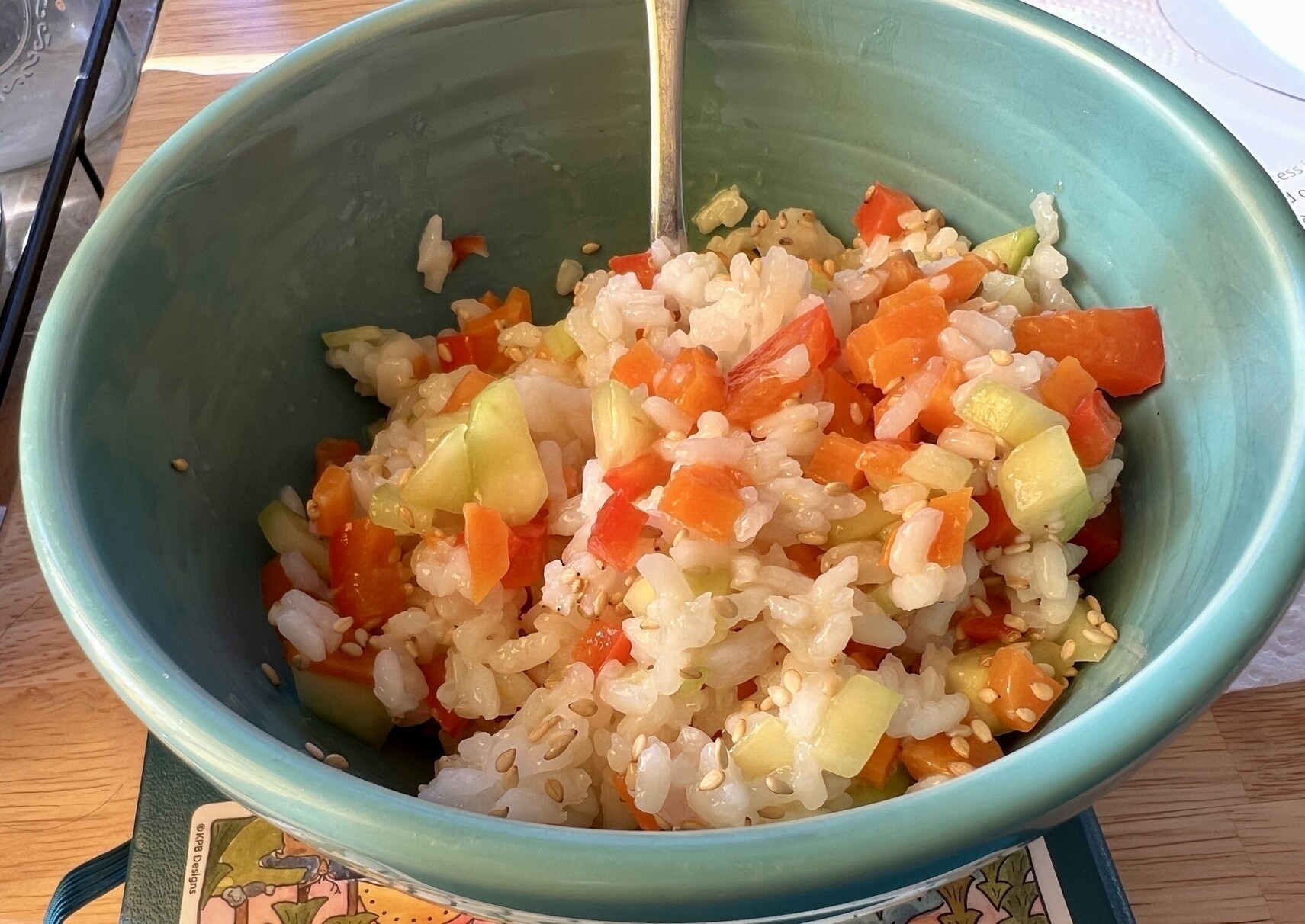 I made Sushi Rice Salad tonight from the Moosewood Low Fat Cookbook. Itβs good! Family consensus is positive, Jupes thinks it has a bit too much wasabi but I like it.