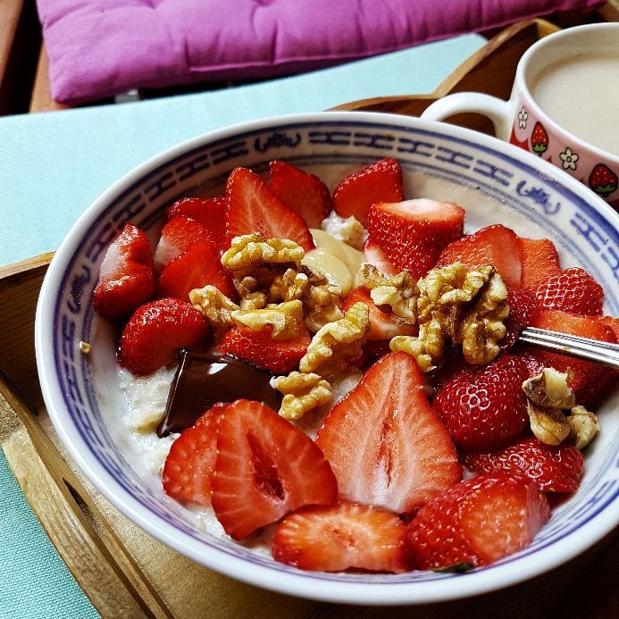 #DailyPorridge this morning: Porridge, strawberries, dark chocolate, walnuts.