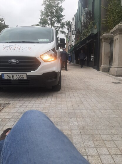 I'm sitting there having my lunch on the lovely newly landscaped Francis Street when this guy pulls up in his van onto the paved area right in front of me, sticks on his hazards, leaves the engine running and takes out his phone to make a call.