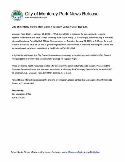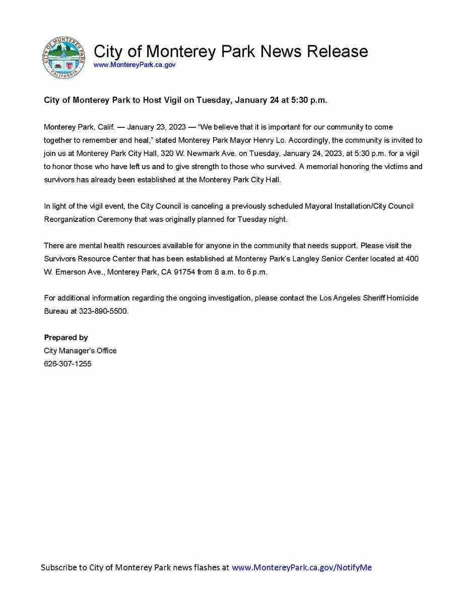 City of Monterey Park to Host Vigil on Tuesday, January 24 at 5:30 p.m.
