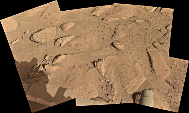Curiosity rover's latest workspace, imaged during sol 3853 (June 9, 2023) after a drive towards the Southeast of 5.6 meters (18.3 ft) to site #101/1492. This processed mosaic of six overlapping Bayer reconstructed left-side MastCam frames covers an area about 2 meters (~6.5 feet) across. It shows details within the workspace accessible to the instruments and tools on the rover's two meter-long robotic arm. Credit: NASA/JPL-Caltech/MSSS/fredk