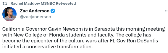 Maddow RTed this without offering any commentary--meanwhile, the phrase "conservative transformation" is used to describe DeSantis Christofascism and destruction of public education in Florida. Book bans? Black studies/history bans? Don't say gay law? no no, it's 'conservative transformation'