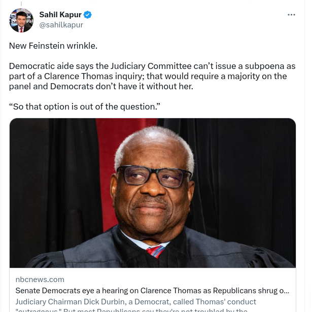 Also, for anyone going on about how Feinstein's absence is no biggie: SJC can't issue subpoenas in the Thomas affair without her vote.