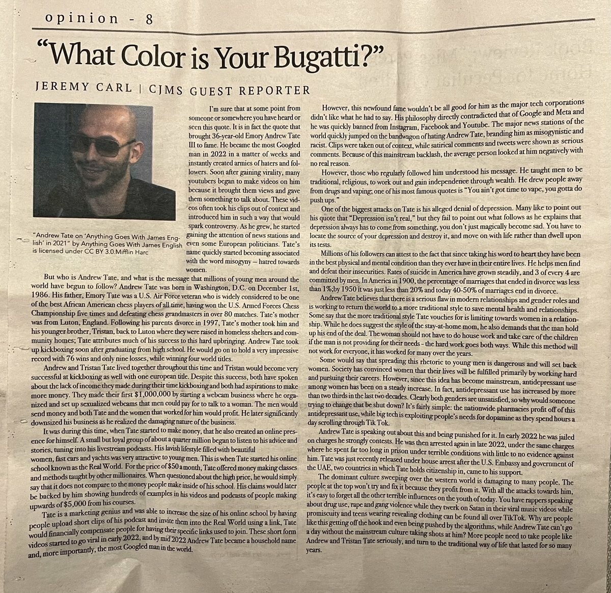 Publishing an article (written by an open white nationalist) praising rapist and human trafficker Andrew Tate, in a high school paper is gross and dangerous. But I gotta admit “twerk on satan” would make a great band name