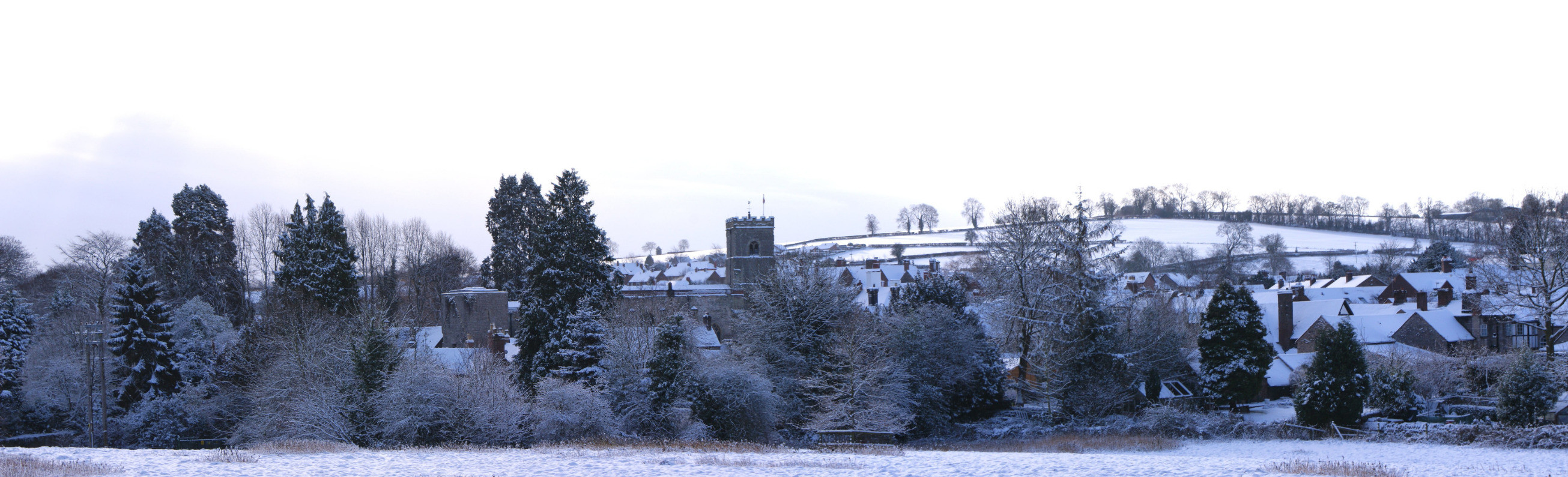 A panorama of part of the town of Much Wenlock in Shropshire, in the snow.
