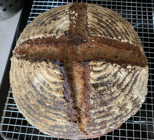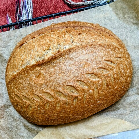I made this multigrain sourdough loaf for a friend who has never tried my bread. I also made a second loaf, and I must say, it's delicious. It has yecora rojo, einkorn, and danko rye berries from a local supplier in Austin, all of which I milled myself. This is my best, most reliable recipe so far.