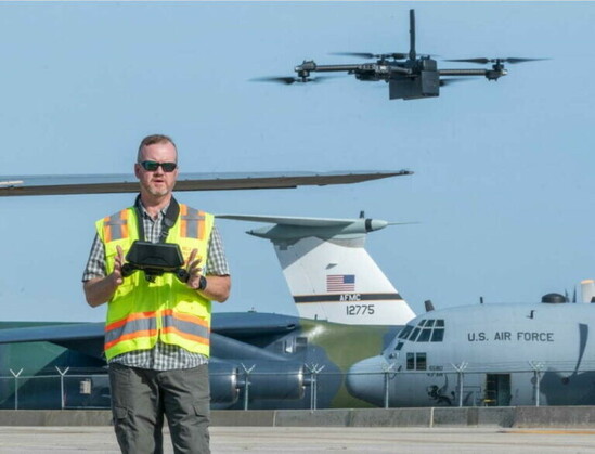 A Skydio X2D Small Unmanned Aerial System drone was tested during its first operational flight around a static aircraft at Dover Air Force Base, Delaware, on Nov. 4, 2022.The 436th Airlift Wing Plans and Programs office and the Bedrock Innovation Lab jointly run