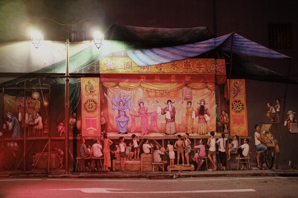#mural #muralart depicting roadside Chinese Opera performance. The red hue is from the tail lights of a passing car.