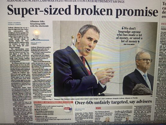 Without acknowledging $Trillion national debt and still generous concessional tax on $3m+ superannuation accounts + fact that electors get to vote on proposal at 2025 fed election, R&L Murdoch declare “class warfare” over “broken promise”. Murdochs to tear down @AlboMP.