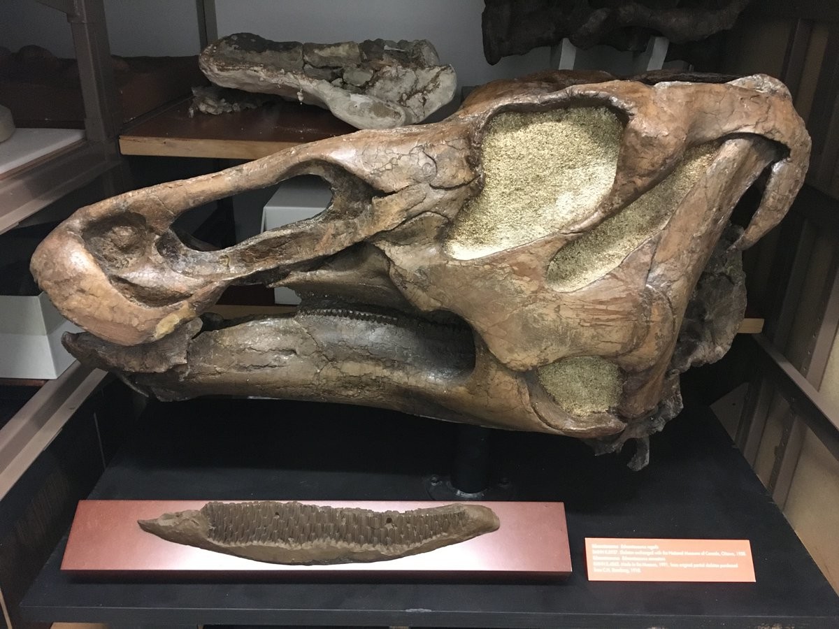From behind the scenes @NHM_London@twitter.com for this #FossilFriday and #MuseumfromHome, here's the skull, tail and scaly skin impression of the latest Cretaceous duckbilled dinosaur Edmontosaurus, perhaps the most abundant herbivore of its time, with an impressive set of gnasher #NHMdino