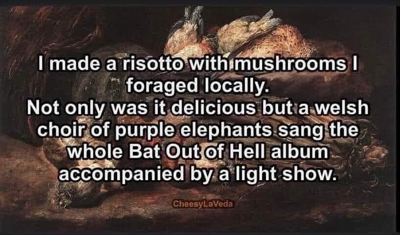 Text in picture reads 'I made a risotto with mushrooms I foraged locally. Not only was it delicious but a Welsh choir of purple elephants sang the whole Bat Out of Hell album accompanied by a light show.'