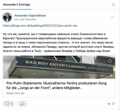 @Konzerthaus_DO@twitter.com @abmann71@twitter.com Reaktion des #musicaeterna #currentzis Tenors Alexander Gajnutdinov auf unsere Recherche seines&Artem Volkovs Song:nennt uns Faschisten!So diskreditiert Musicaeterna journalist.Arbeit&Freiheit i.D!Was sagt @SZ@twitter.com #stallknecht @FAZ_Feuilleton@twitter.com #thaler dazu?
