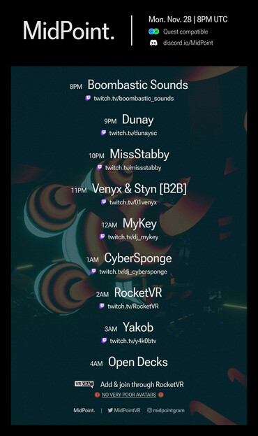 #VRChat #Techno #Quest2 #BASS #DnB #TechTrance #House #EDM #Techno #Metaverse #VRC #Quest #QuestCompatible #LiveMusic #MusicEvent #VRDJ #LiveDJ #Traktor #PioneerDJ #Roland #DenonDJ #Numark #MidPointVR #MidPoint #B2BDJ #CloudComputing #VRCDN #Sunday #November