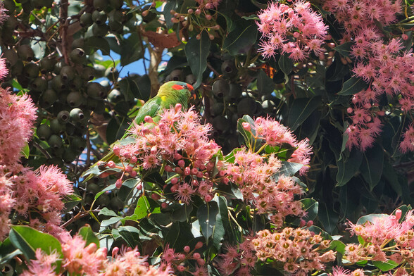 A Musk Lorikeet pauses briefly during it's nectar gathering in a Pink Flowering Gum tree.