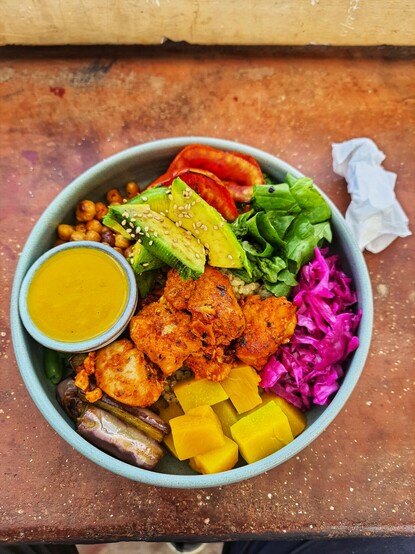 My Fitness Journey - Last salad of the week. It was amazing. Ventured to #Annamaya for a change for lunch. Grilled chicken, quinoa, eggplant, pea and cabbage salad with some avocado on the side. So tasty. Will be coming back here much more regularly. #myFitnessJourney #nomnom one more fast to go this week