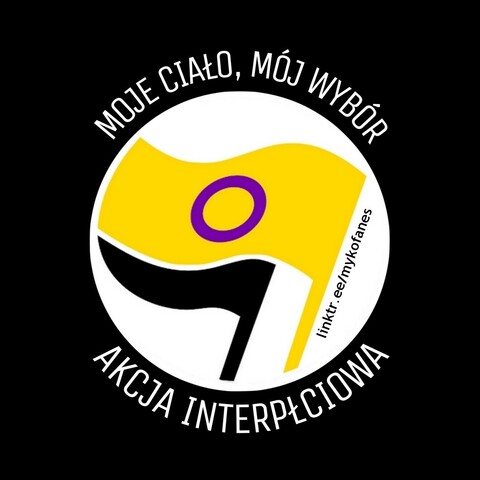 pl: flaga interpłciowa (żółta fioletowym okręgiem na środku) i za nią mniejsza czarna flaga w białym kole na czarnym tle (wzór akcji antyfaszystowskiej). Wokół koła biały napis "moje ciało, mój wybór - akcja interpłciowa"